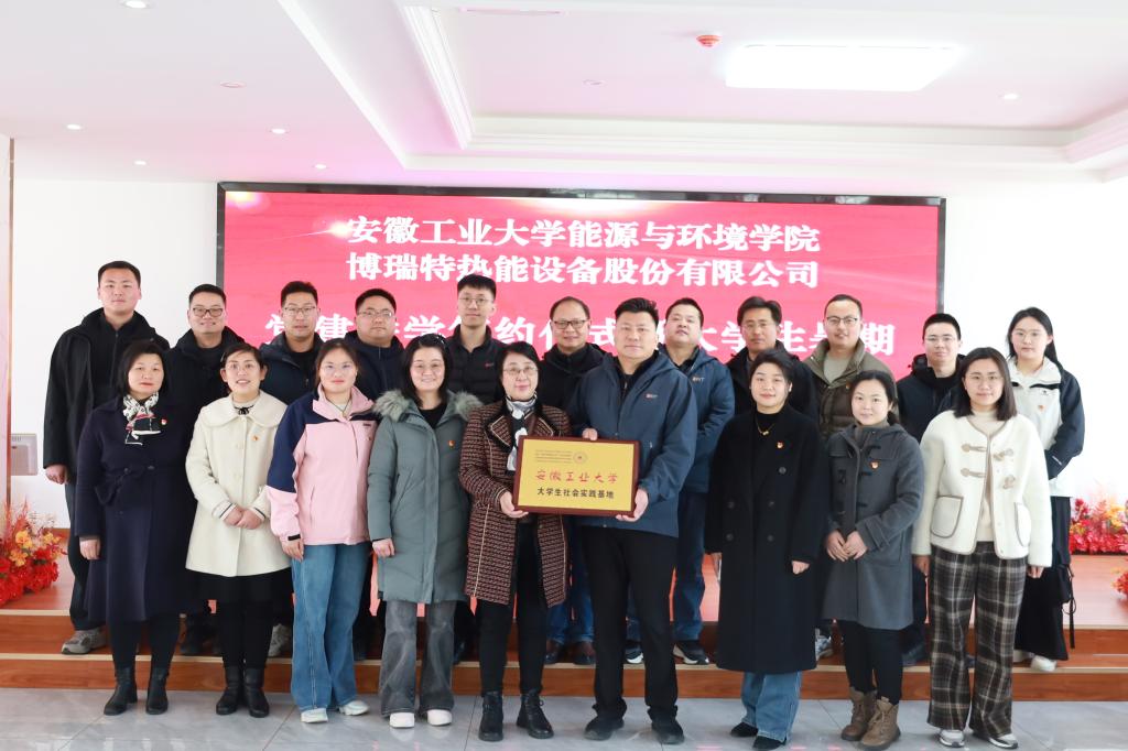 會上,顧明言代表安徽工業(yè)大學(xué)為公司進(jìn)行"大學(xué)生社會實踐基地"授牌,能環(huán)學(xué)院黨委書記謝文平與公司黨支部共同簽署黨建共建協(xié)議書,雙方與會人員合影留念。
